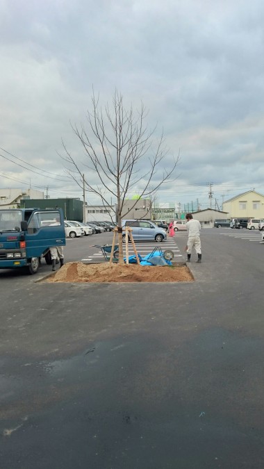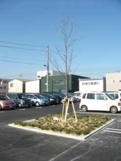 駐車場の様子です。等間隔で植わっているのはユリノキという樹木。紅葉や花が楽しめ、駐車場に並木の景観を作れるよう計画しました。