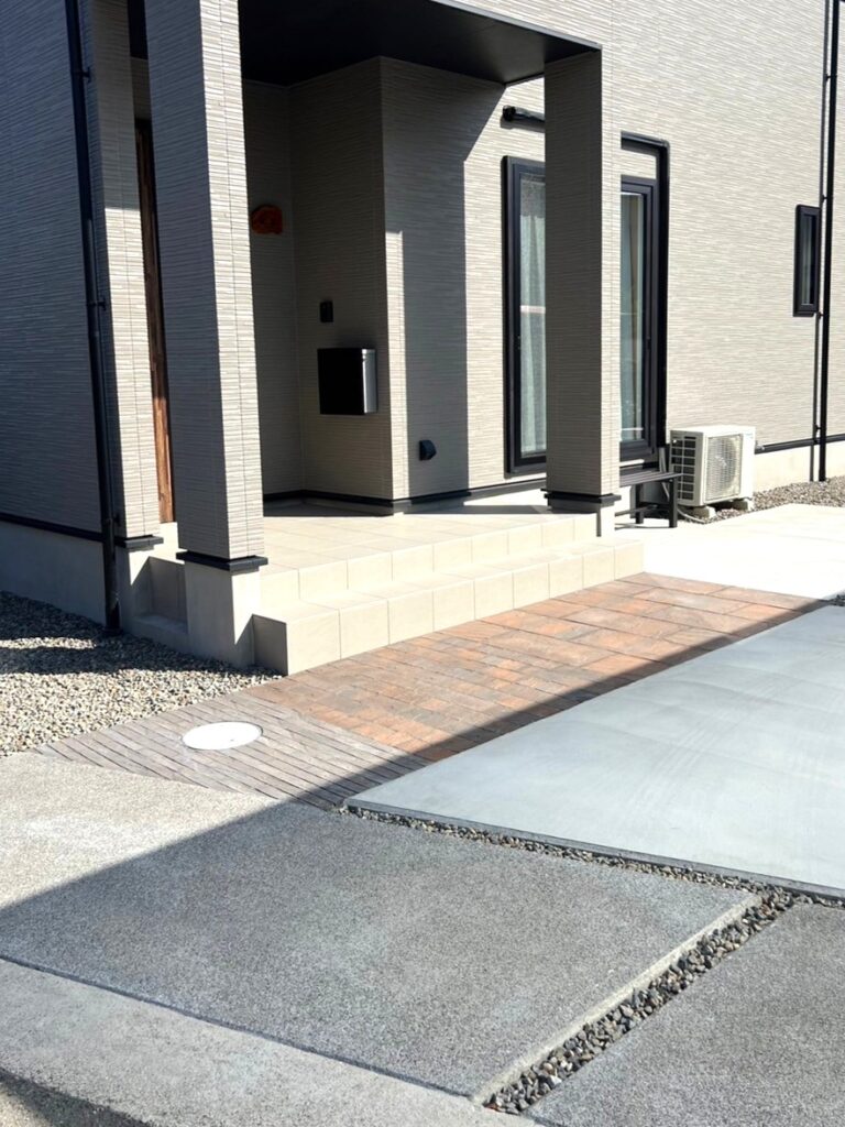 石畳調のアプローチが映えるシンプル外構