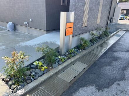 玄関前のライン花壇にも栗石を敷き詰め、日陰でも生育可能な様々なカラーリーフの植栽を植えこみました。