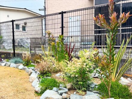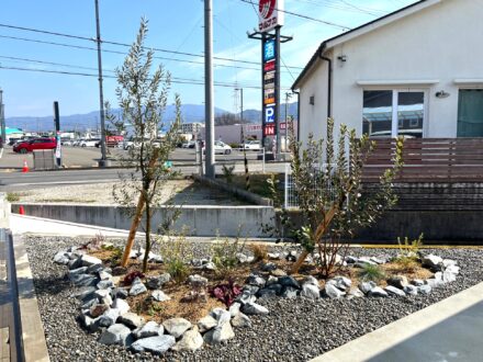 植栽スペースは割栗石で縁取り景石風に配置してウエストリンギアやシルバープリペットなど低木や下草をバランスよく植えて華やかに。