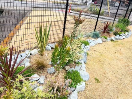 中庭の植栽はリュウカデンドロンなどのネイティブプランツやニューサイラン、コルジリネレッドやハーブ系植物、セダム系植物をグランドカバーに植え付けしました。