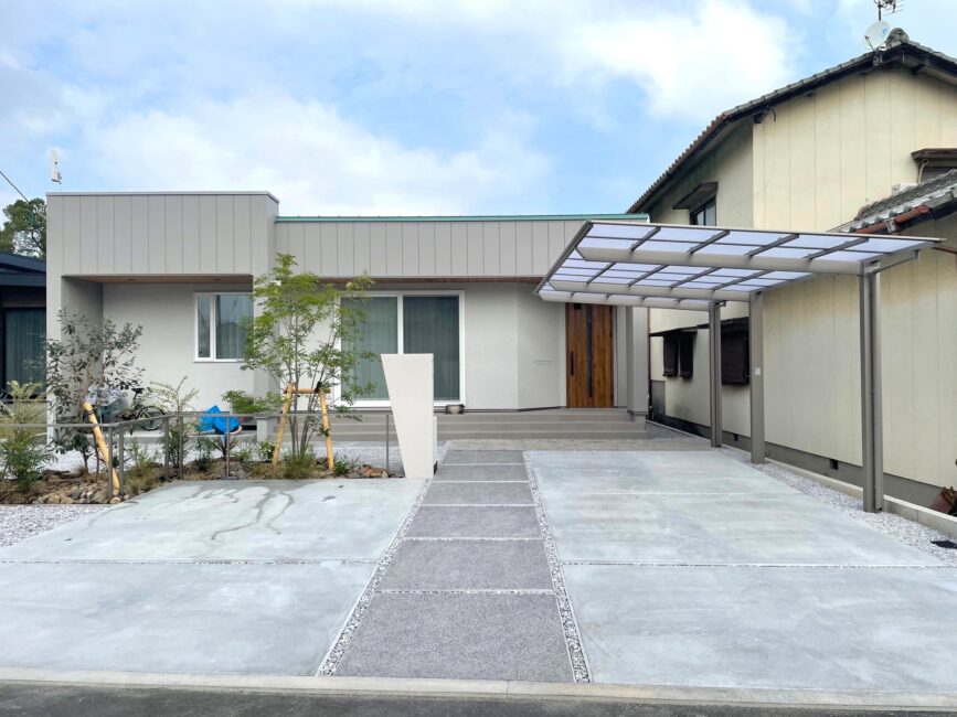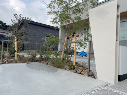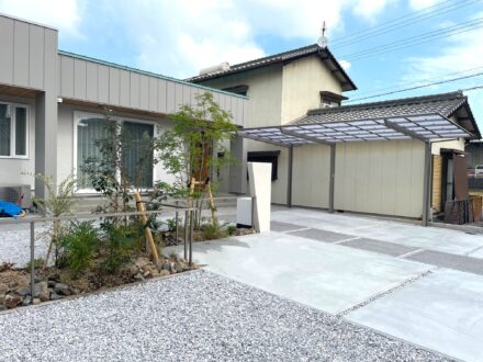 砂利やコンクリートのシンプルな舗装に、植栽の柔らかなラインが心地よいコントラストを生み、住まい全体に“呼吸するようなナチュラル感”をプラス。
