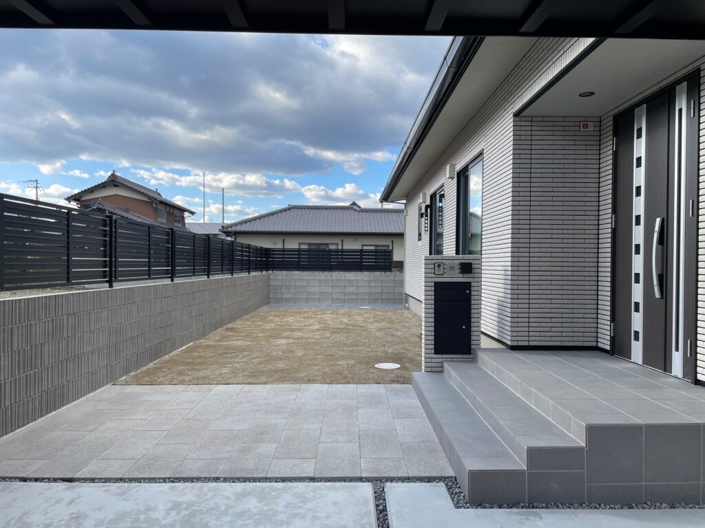 白系サイディングに映えるブラックのエクステリアが際立つモダンな外構